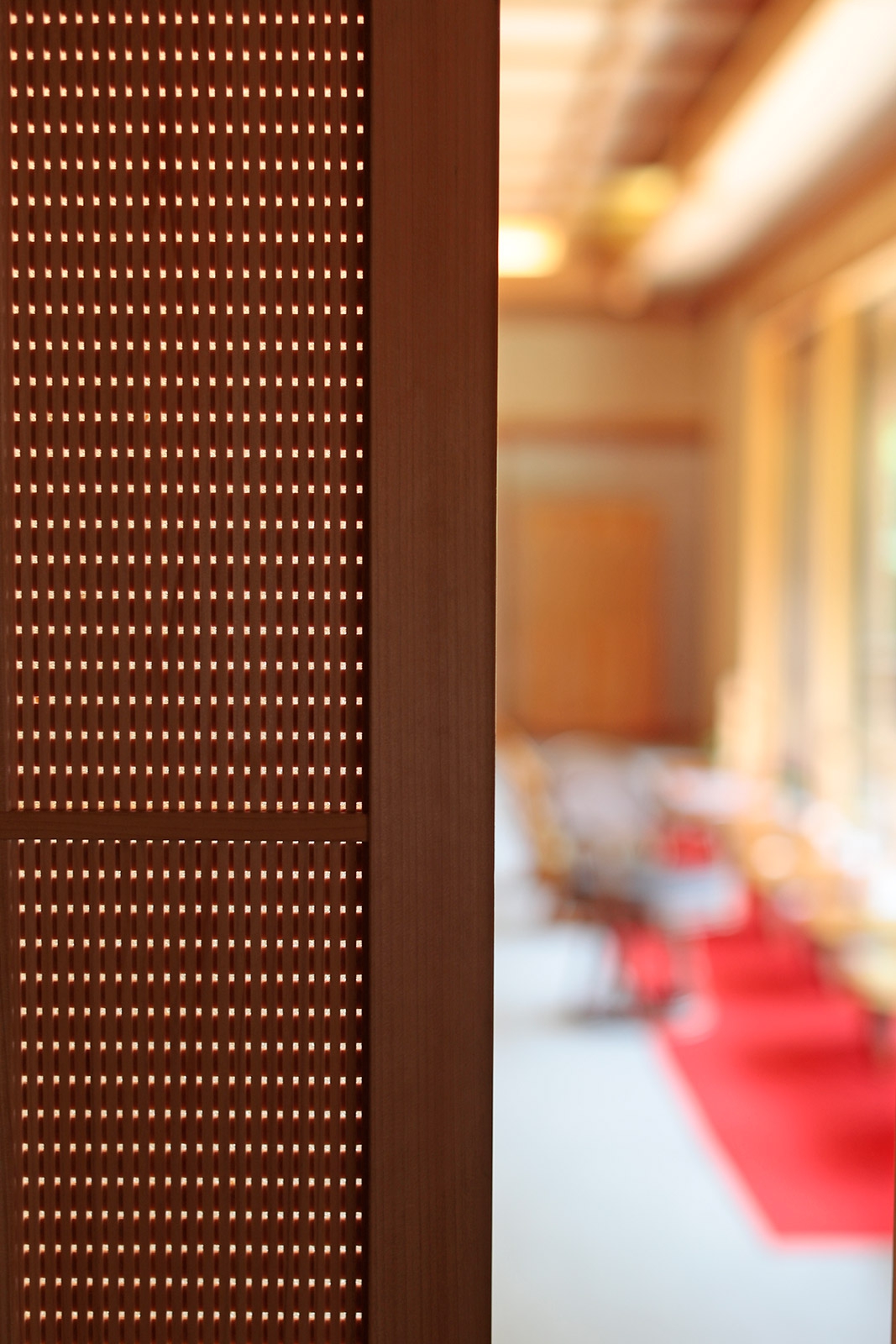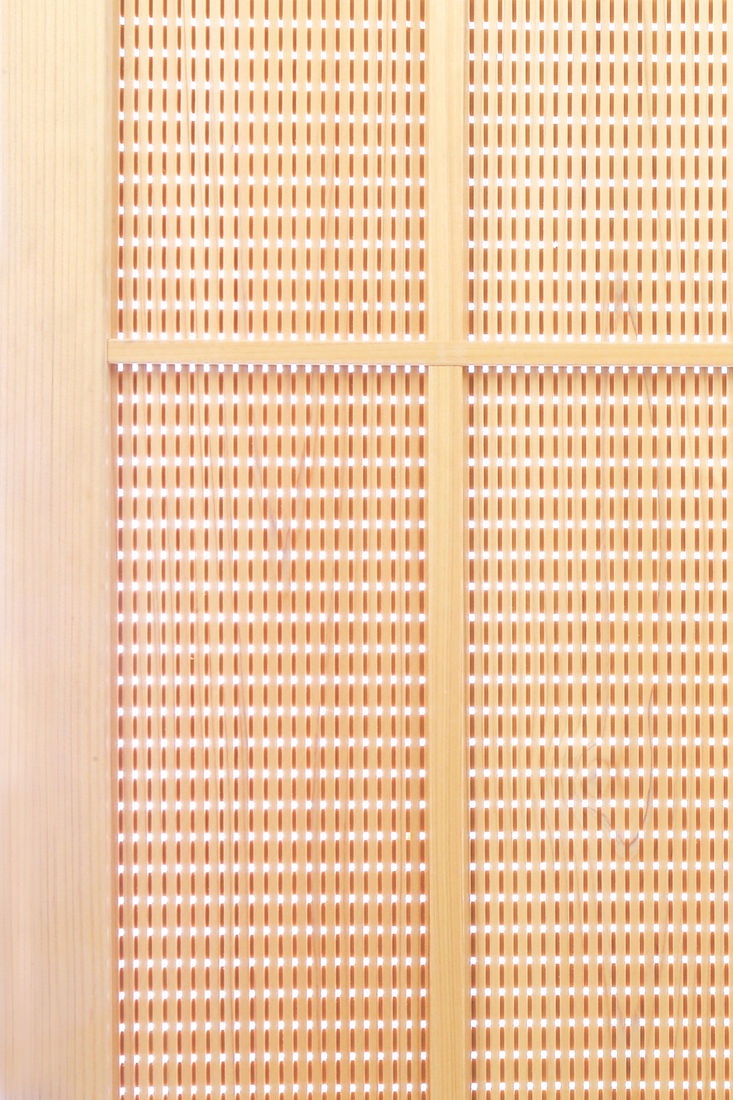 水平、垂直のスリットが特徴の建具です。菱形模様のアロマスリットとは一味違う印象でシンプルなお部屋と相性が良いデザインです。枠はヨゴレ・ヤケ止め塗装を施しています。